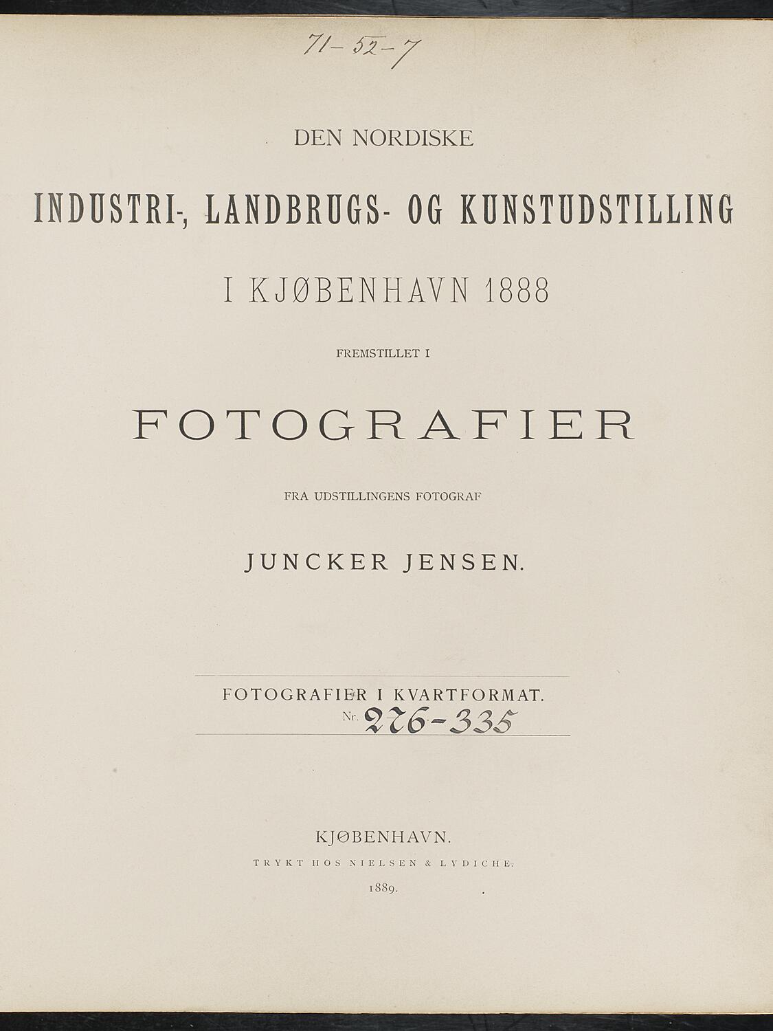 Den Nordiske Industri-, Landbrugs- og Kunstudstilling 1888. Fremstillet i Fotografier fra Udstillingens fotograf Juncker Jensen i kvartformat.