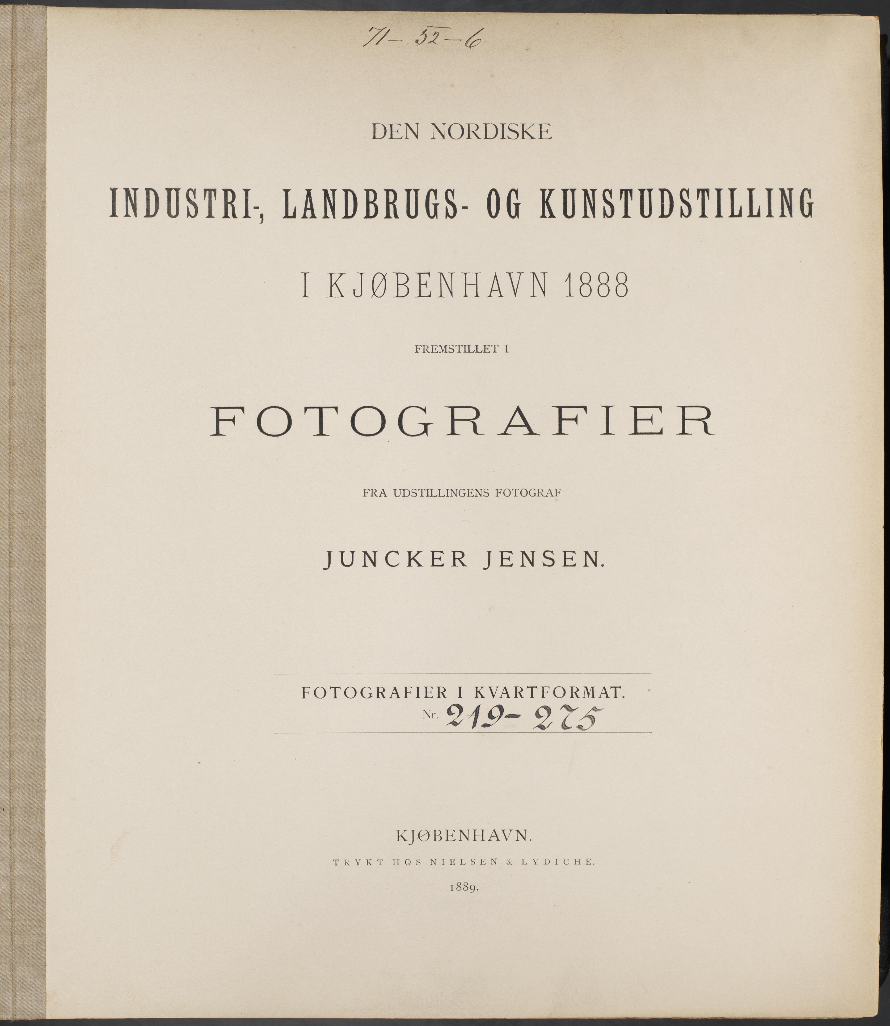 Den Nordiske Industri-, Landbrugs- og Kunstudstilling 1888. Fremstillet i Fotografier fra Udstillingens fotograf Juncker Jensen i kvartformat.