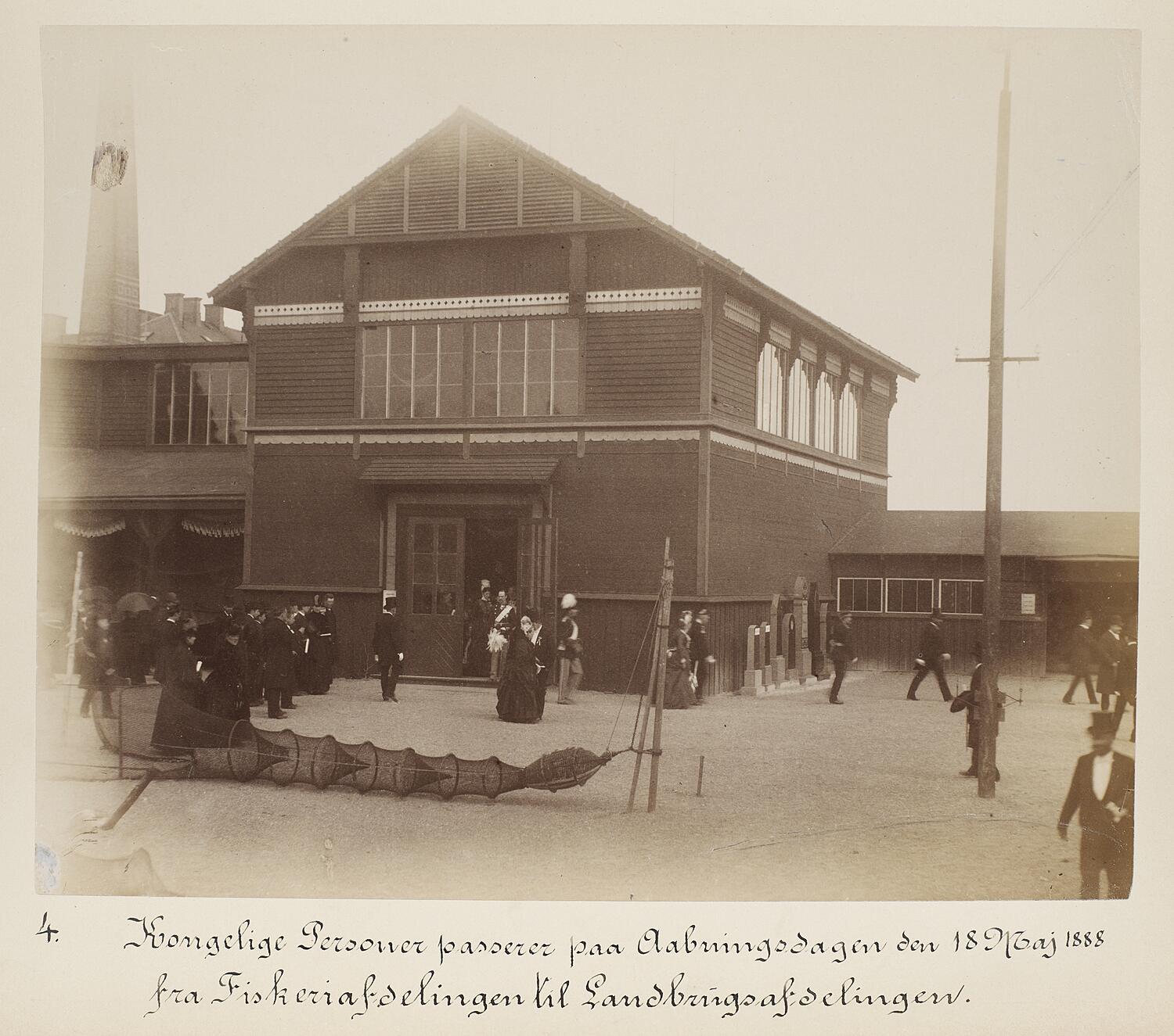 Kongelige Personer passerer paa Aabningsdagen den 18. Maj 1888 fra Fiskeriafdelingen til Landbrugsafdelingen